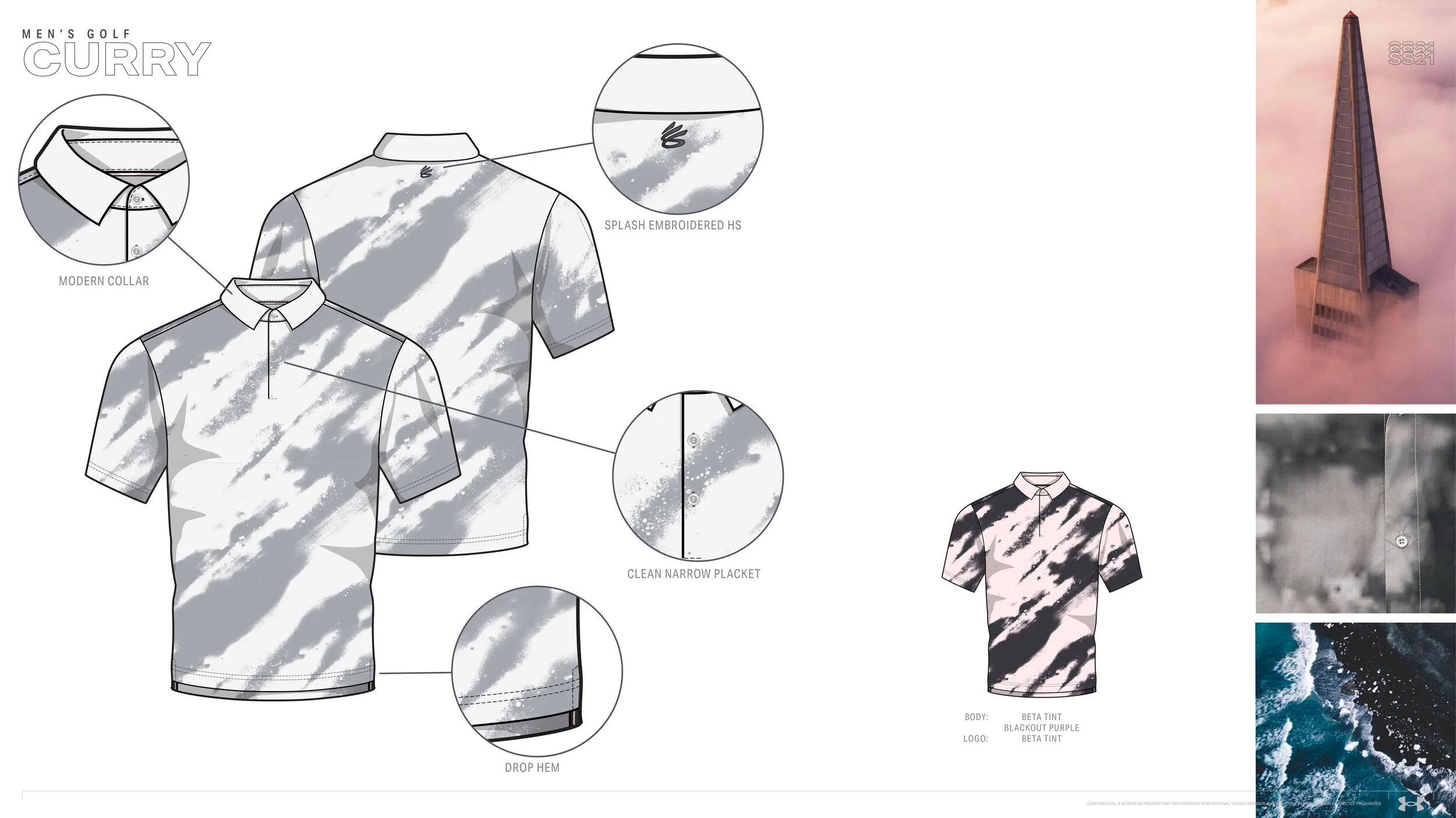Invoking a Bay Area fog as it moves from Dawn to Dusk through color with early sunrise pinks to deep evening purples grounds the collection in Steph’s hometown. Haze-inspired prints and graphics help bring the story to life. Trend-forward silhouettes take Steph’s ‘Shimmy’ onto the golf course.